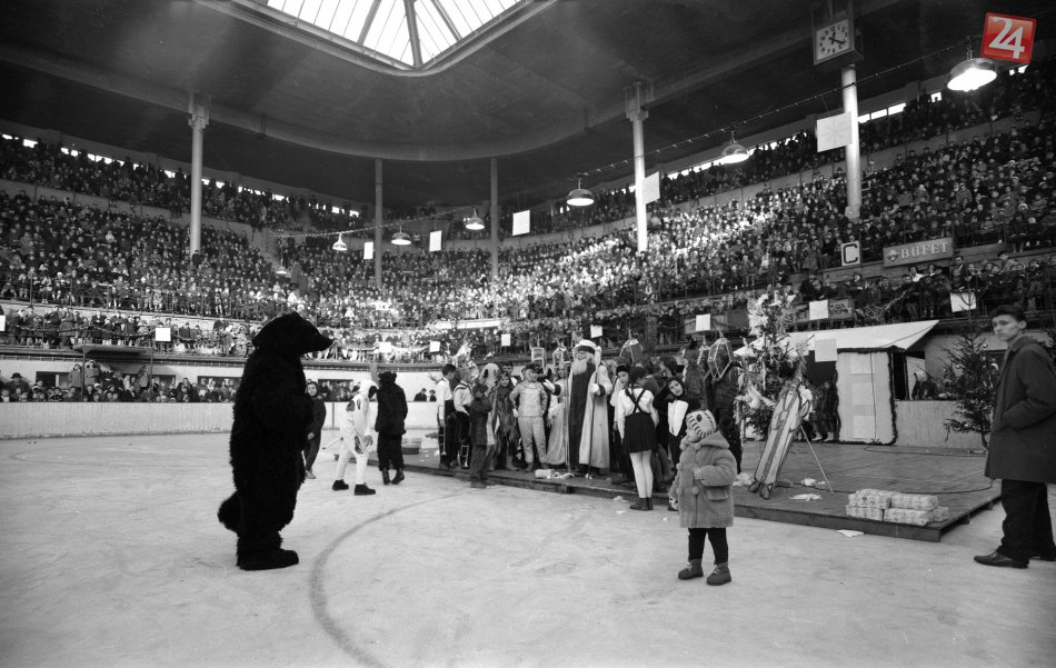 Na archívnej snímke z 20. decembra 1959 desaťtisíc pionierov z bratislavských škôl víta Deda Mráza na zimnom štadióne v Bratislave.