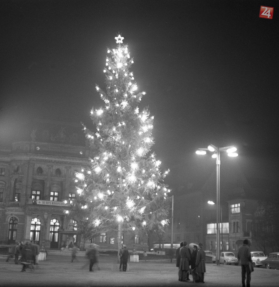 Na archívnej snímke z 17. decembra 1968 v Bratislave pohľad na vianočný strom pred Slovenským národným divadlom.