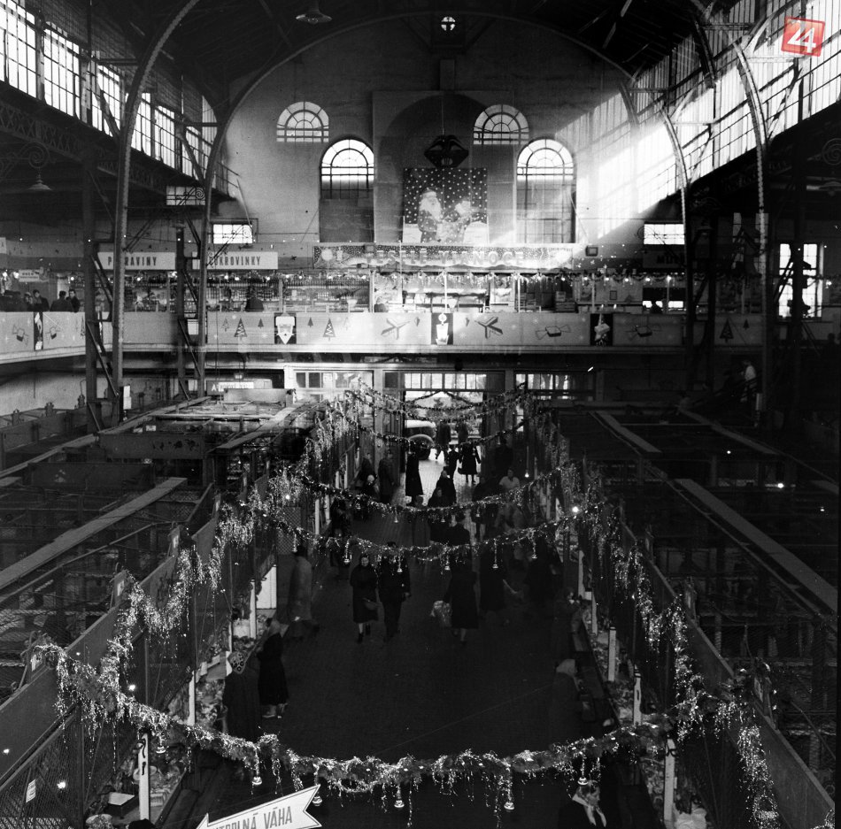 Na archívnej snímke slávnostne vyzdobená tržnica k vianočnému trhu. V Bratislave, 19. decembra 1958.